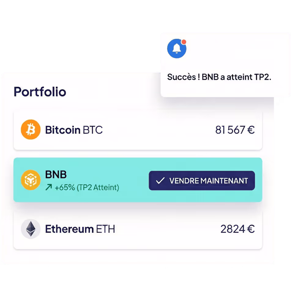Dans votre tableau de bord, sélectionnez la cryptomonnaie de votre choix, puis configurez votre alerte de vente en indiquant le seuil auquel vous souhaitez être notifié. Vous ne manquerez plus jamais une opportunité de profit.